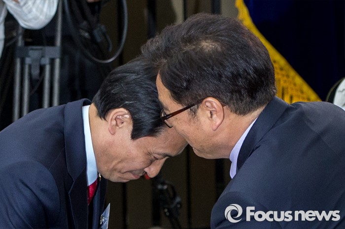 (서울=포커스뉴스) 우상호 더불어민주당 의원이 4일 오후 서울 여의도 국회에서 열린 원내대표선거에서 신임 원내대표로 선출된 뒤 결선투표까지 경합을 벌인 우원식 의원과 인사하고 있다.