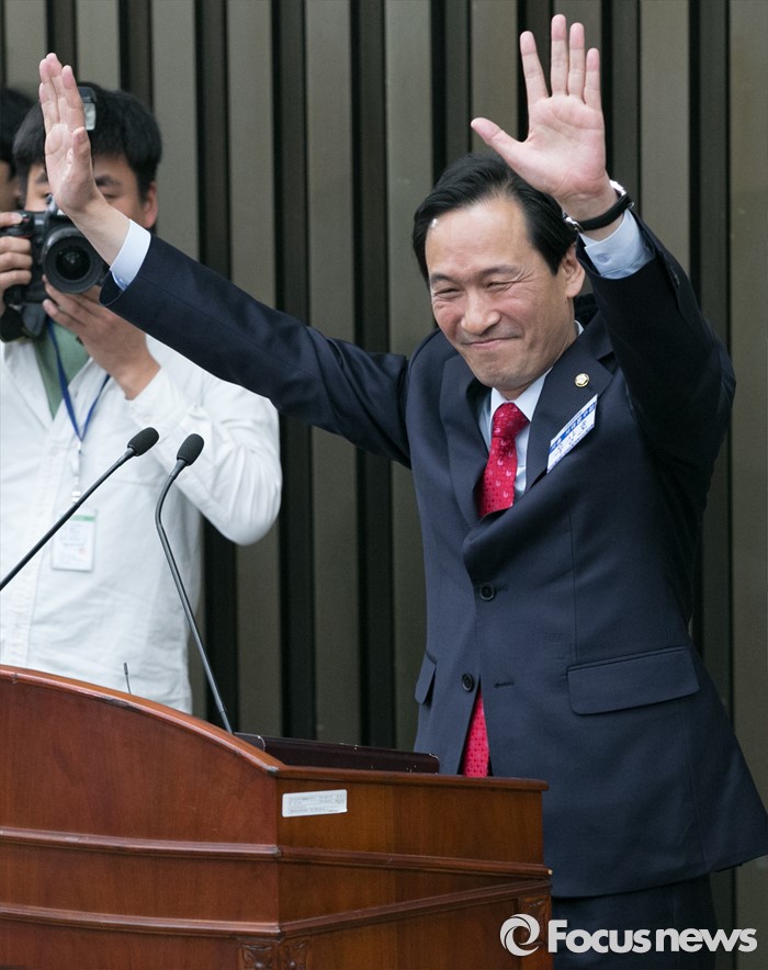 | △ 두 손 들어 기뻐하는 우상호 신임 원내대표 |
