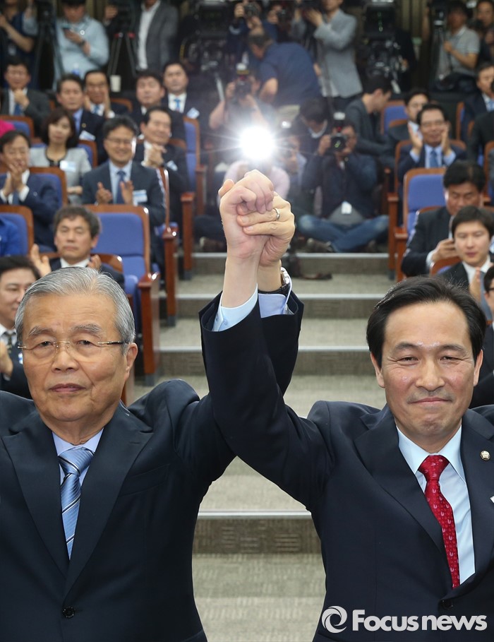 (서울=포커스뉴스) 4일 오후 서울 여의도 국회에서 더불어민주당 20대 국회 1기 원내대표 선출을 위한 당선자 총회에 참석한 김종인(왼쪽) 비대위 대표와 우상호 신임 원내대표가 취재진을 향해 포즈를 취하고 있다.