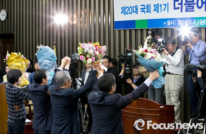 (서울=포커스뉴스) 4일 오후 서울 여의도 국회에서 열린 더불어민주당 20대 국회 1기 원내대표 선출을 위한 당선자 총회에 참석한 김종인 비대위 대표와 우상호 신임 원내대표, 김영주 선거관리위원장, 경쟁 후보였던 우원식 의원이 축하의 꽃다발을 들고 포즈를 취하고 있다.