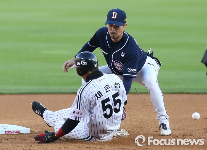 (서울=포커스뉴스) 4일 서울 잠실구장에서 열린 2016 프로야구 두산-LG 경기 1회말 2사후 중전안타로 진루한 LG 채은성이 히메네스 타석때 2루 도루에 성공하고 있다.