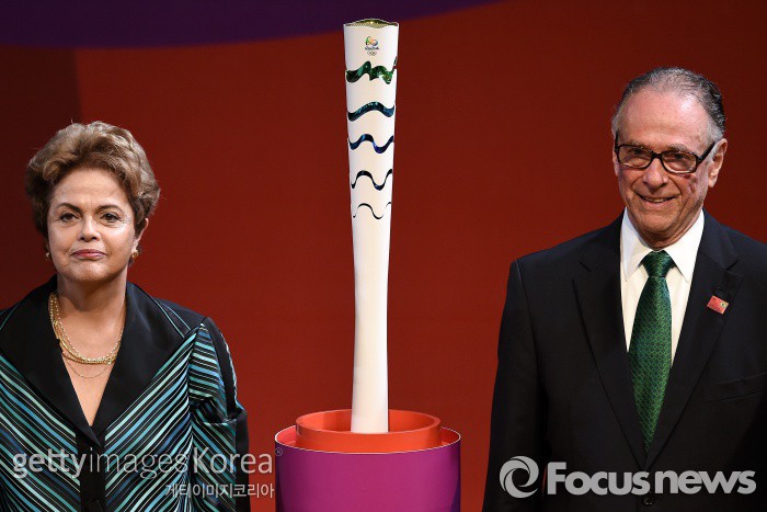 지우마 호세프 브라질 대통령은 탄핵 정국 속에 성화 봉송 행사 불참 의사를 밝힌 바 있다. 그러나 첫 번째 주자에게 성화를 넘겨주는 행사에 등장해 100명 넘는 시민들이 규탄 시위를 벌이기도 했다.2016 리우데자네이루 올림픽을 95일 앞두고 지난 3일(현지시간) 브라질에 성화가 도착했다. 올림픽 성화는 95일간 브라질 전역을 돌아본 뒤 개막 전날인 8월 4일 다시 리우로 돌아오게 된다. (Photo by Buda Mendes/Getty Images)2016.05.04 ⓒ게티이미지/이매진스