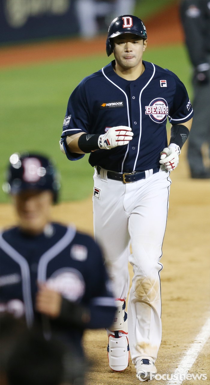 (서울=포커스뉴스) 4일 서울 잠실구장에서 열린 2016 프로야구 두산-LG 경기 6회초 1사 1,3루에서 두산 김재환이 우월 3점 홈런을 치고 3루를 돌아 홈인하고 있다.