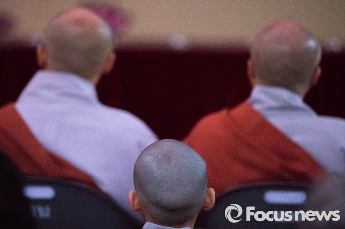 (서울=포커스뉴스) 4일 오후 서울 종로구 조계사에서 열린 연등 점등식 행사장에 동자승들이 참석해 있다.