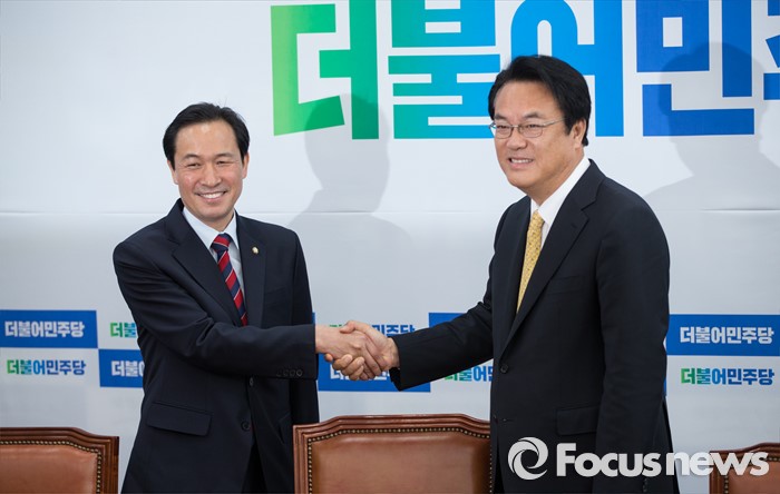 (서울=포커스뉴스) 5일 오전 서울 여의도 국회 더불어민주당 원내대표실을 예방한 정진석(오른쪽) 새누리당 신임 원내대표가우상호 더불어민주당 원내대표와 인사하고 있다.