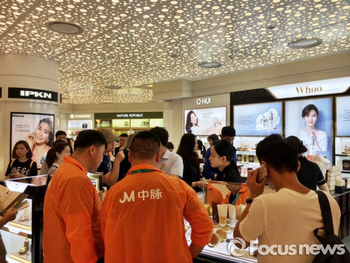 중마이그룹 직원들이 가장 많이 몰린 곳은 8층 화장품 면세 매장이었다. 아모레퍼시픽의 설화수·헤라·에뛰드하우스·이니스프리, LG생활건강의 후·숨·빌리프 등은 줄을 서서 기다려야 구매할 수 있을 정도였다.