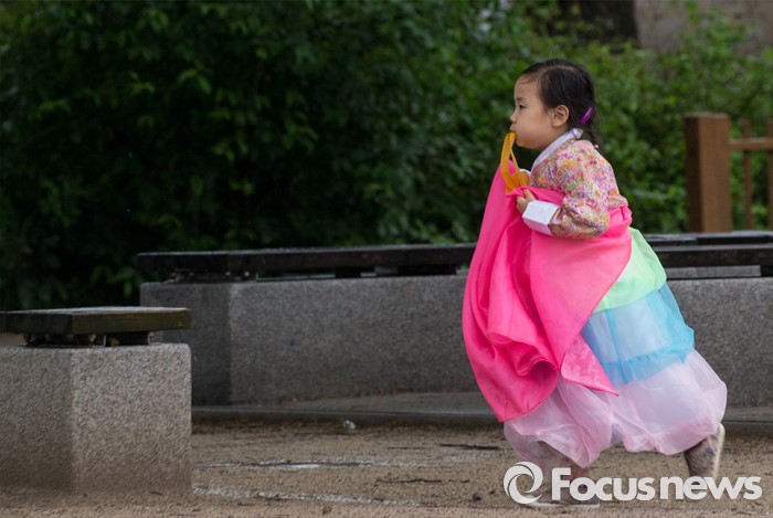 (서울=포커스뉴스) 임시공휴인인 6일 오후 서울 경복궁에서 한복을 차려입은 어린이가 즐거운 시간을 보내고 있다.