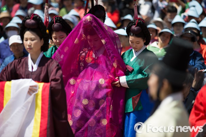 (서울=포커스뉴스) 7일 오전 서울 구로구 궁동저수지생태공원에서 '정선옹주 시집가는 날' 참가자들이 전통혼례를 재현하고 있다. 정선옹주는 조선 14대 임금인 선조와 후궁 정빈 민씨의 딸이다.