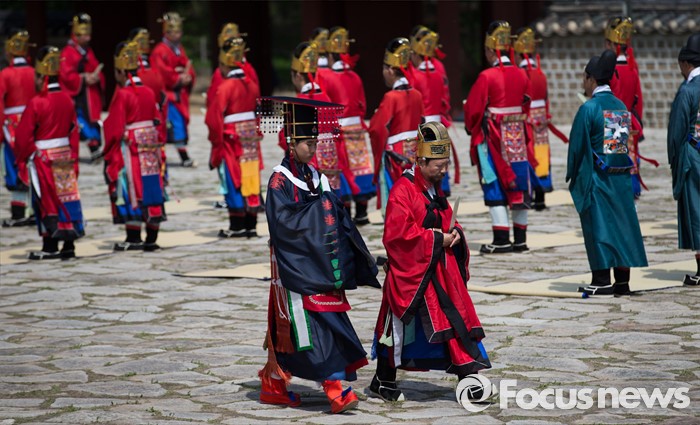 (서울=포커스뉴스) 7일 오후 서울 종묘 정전에서 열린 '조선의 세자빈 혼례를 고하다' 행사에서 참가자들이 묘현례를 재현하고 있다. 묘현례는 왕비나 세자빈이 왕실 혼례를 마친 후 조선왕조 역대 왕가 왕비의 신주가 모셔진 종묘를 알현하는 의례로서 조선시대 종묘에서 행해지는 국가의례 중 왕실 여성이 참여하는 유일한 행사이다.