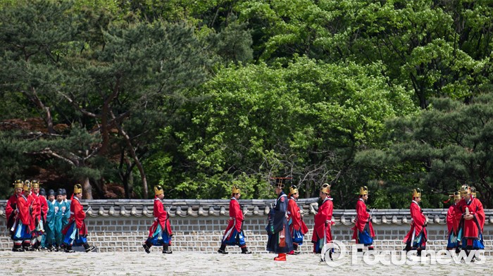 (서울=포커스뉴스) 7일 오후 서울 종묘 정전에서 열린 '조선의 세자빈 혼례를 고하다' 행사에서 참가자들이 묘현례를 재현하고 있다. 묘현례는 왕비나 세자빈이 왕실 혼례를 마친 후 조선왕조 역대 왕가 왕비의 신주가 모셔진 종묘를 알현하는 의례로서 조선시대 종묘에서 행해지는 국가의례 중 왕실 여성이 참여하는 유일한 행사이다.