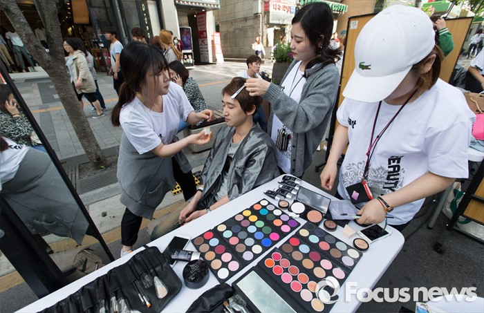 (서울=포커스뉴스) 7일 오후 서울 서대문구 신촌 차없는 거리에서 열린 제1회 신촌 뷰티 페스티벌 '뷰티체어 101' 행사 참가자들이 메이크업과 머리 손질을 받고 있다.