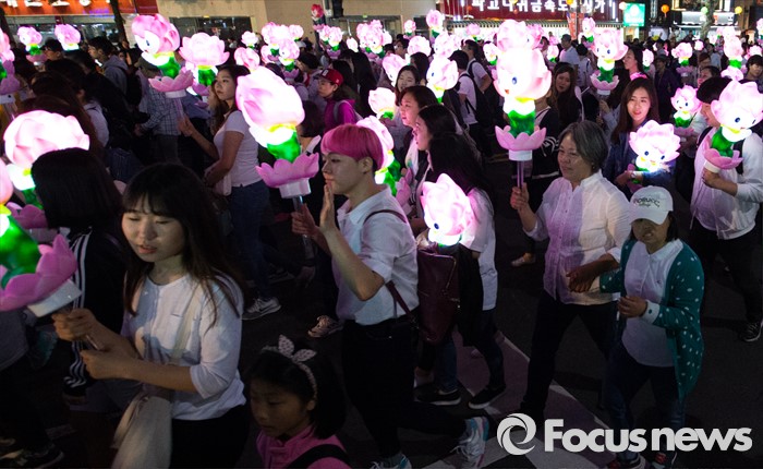 (서울=포커스뉴스) 부처님 오신날을 일주일 앞둔 7일 오후 서울 종로구 흥인지문부터 시작해 조계사까지 이어지는 화려한 연등 행렬이 펼쳐지고 있다.