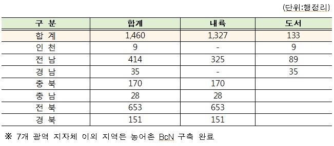 농어촌 BcN 구축사업은 50세대 미만 소규모 농어촌 마을에 100 Mbps급의 인터넷을 연결해 도시와 농촌간 네트워크 인프라 격차를 해소하고 보편적 방송통신서비스를 제공하는 사업이다. 2010~2017년까지 전국의 1만3217개 마을에 BcN를 구축하는 것이 목표다.