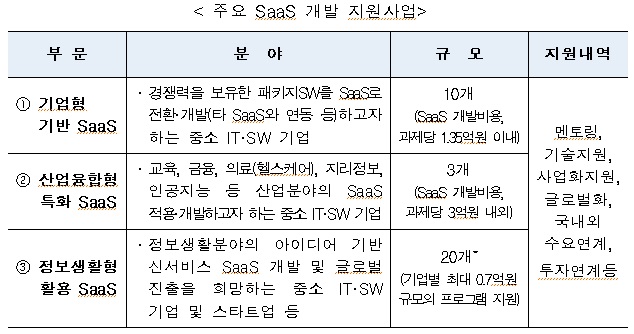 서석진 미래부 소프트웨어정책관은 “클라우드 시장은 아직 형성 초기단계이므로, 기존 우리가 경쟁력을 갖고 있는 분야와 국내 기업들이 창의적인 아이디어로 다양한 SaaS 개발에 힘써 준다면, 세계적인 SaaS가 탄생할 수 있다고 보며, 미래부도 이를 위해 정책적 지원을 아끼지 않겠다”고 밝혔다.주요 SaaS 개발 지원사업 세부내용.<표제공=미래부>