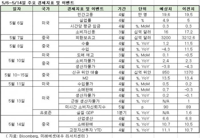 이번주 주목할 경제지표는 오는 13일(현지시간) 미국 4월 소매판매 발표가 있다. 현재 시장에서는 전월보다 0.7% 증가할 것으로 보고 있다.
