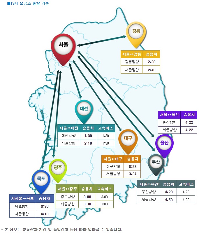 주요도시에서 서울까지 소요되는 시간은 오후 7시 기준 강릉 2시간 40분, 부산 4시간 50분, 광주 3시간 30분, 목포 4시간 10분, 대전 2시간 10분 등이다.