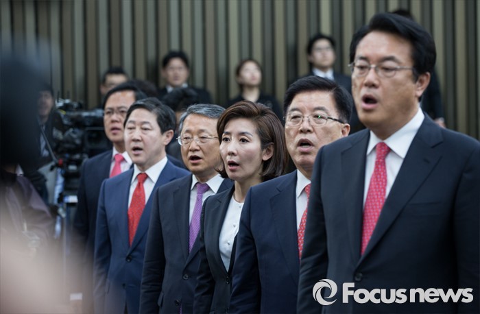 | △ 애국가 부르는 새누리당 원내대표 후보자들 |