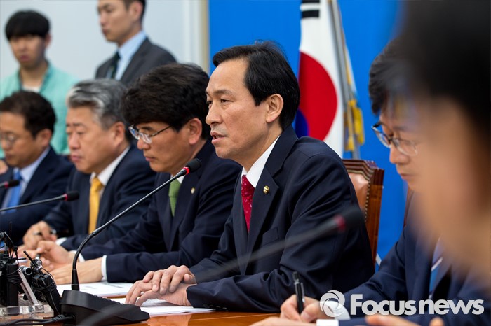 (서울=포커스뉴스) 우상호 더불어민주당 원내대표가 9일 오전 서울 여의도 국회에서 열린 신임 원내대표단 회의에서 모두발언 하고 있다.