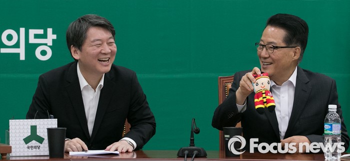 (서울=포커스뉴스) 9일 오전 서울 여의도 국회에서 열린 국민의당 최고위원회의에 참석한 안철수(왼쪽) 상임공동대표와 박지원(오른쪽) 원내대표가 국민대표 이윤정 소방경으로부터 받은 인형을 들고 대화하고 있다.
