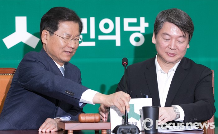 (서울=포커스뉴스) 안철수(오른쪽) 국민의당 상임공동대표가 9일 오전 서울 여의도 국회에서 열린 최고위원회의에 참석해 모두발언에 앞서 천정배 공동대표로부터 마이크를 넘겨받고 있다.