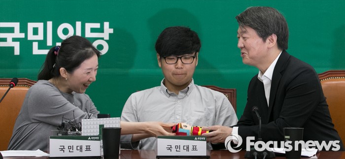 (서울=포커스뉴스) 9일 오전 서울 여의도 국회에서 열린 국민의당 최고위원회의에 참석한 안철수(오른쪽) 상임공동대표가 국민대표 이윤정(왼쪽) 소방경으로부터 인형을 선물받고 있다. 가운데는 이규동 파이어마커스 대표.