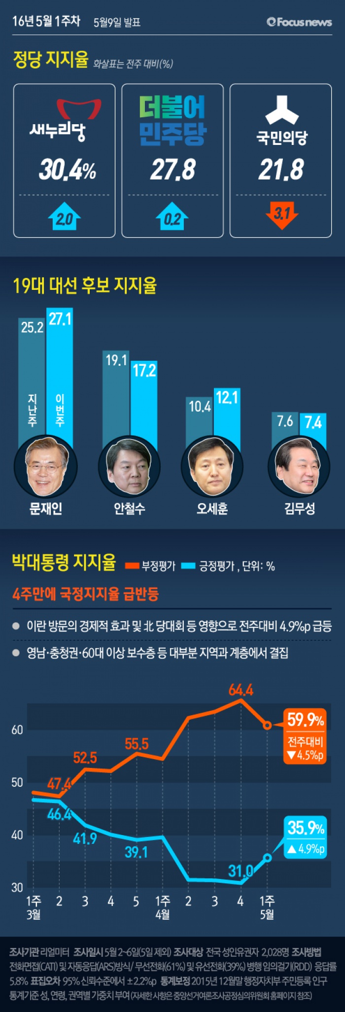 이번 2016년 5월 1주차 주간집계는 2일부터 6일까지(5일 제외) 4일간 전국 19세 이상 유권자 2,028명을 대상으로 전화면접(CATI) 및 자동응답(ARS) 방식으로 무선전화(61%)와 유선전화(39%) 병행 임의걸기(RDD) 방법으로 조사했고, 응답률은 5.8%(총 통화 34,966명 중 2,028명 응답 완료)이다. 통계보정은 2015년 12월말 행정자치부 주민등록 인구통계 기준 성, 연령, 권역별 가중치 부여 방식으로 이루어졌고, 표집오차는 95% 신뢰수준에서 ±2.2%p이다. 일간집계는 ‘2일 이동 시계열(two-day rolling time-series)’ 방식으로 2일 1,015명, 3일 1,016명, 4일 1,009명, 6일 1,012명을 대상으로 실시했고, 응답률은 2일 5.1%, 3일 5.7%, 4일 6.0%, 6일 5.8%, 표집오차는 5일간 모두 95% 신뢰수준에서 ±3.1%p이다. 일간집계의 통계보정 방식은 주간집계와 동일하다.
