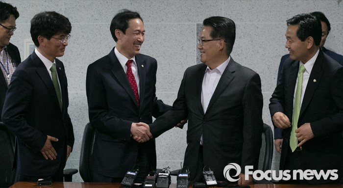 (서울=포커스뉴스) 우상호 더불어민주당 원내대표가 9일 오전 서울 여의도 국회 의원회관에서 박지원 국민의당 원내대표를 예방, 공개발언을 마친 뒤 악수하고 있다. 왼쪽부터 박완주 더불어민주당 원내수석부대표, 우상호 원내대표, 박지원 국민의당 원내대표, 김관영 원내수석부대표.