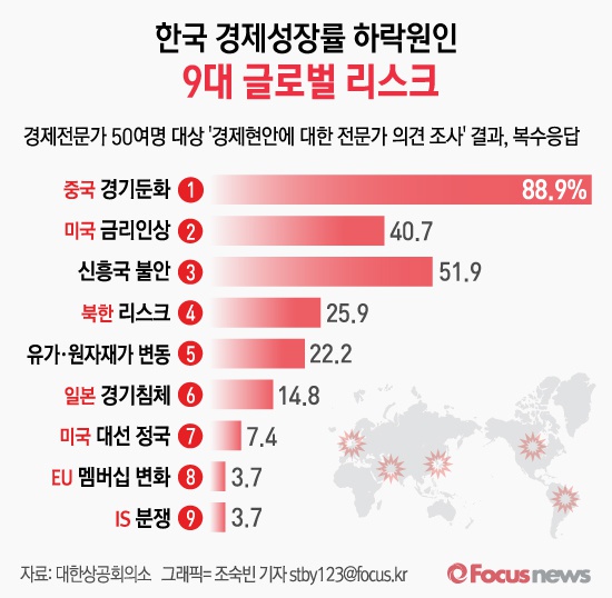 (서울=포커스뉴스) 대한상공회의소가 9일 발표한 경제전문가(학계, 연구계 등) 50여명 대상 ‘경제현안에 대한 전문가 의견 조사’ 결과에 따르면, 우리 경제 성장률 하락원인으로 9대 글로벌 리스크를 꼽았다.