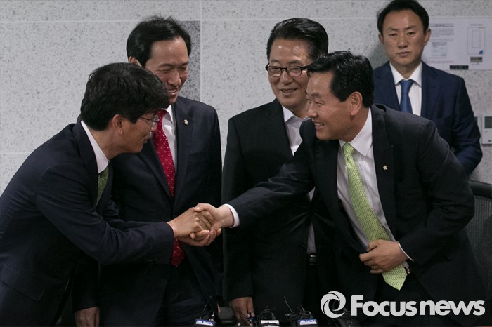 (서울=포커스뉴스) 우상호 더불어민주당 원내대표가 9일 오전 서울 여의도 국회 의원회관에서 박지원 국민의당 원내대표를 예방, 참석자들이 인사하고 있다. 왼쪽부터 박완주 더불어민주당 원내수석부대표, 우상호 원내대표, 박지원 국민의당 원내대표, 김관영 원내수석부대표.