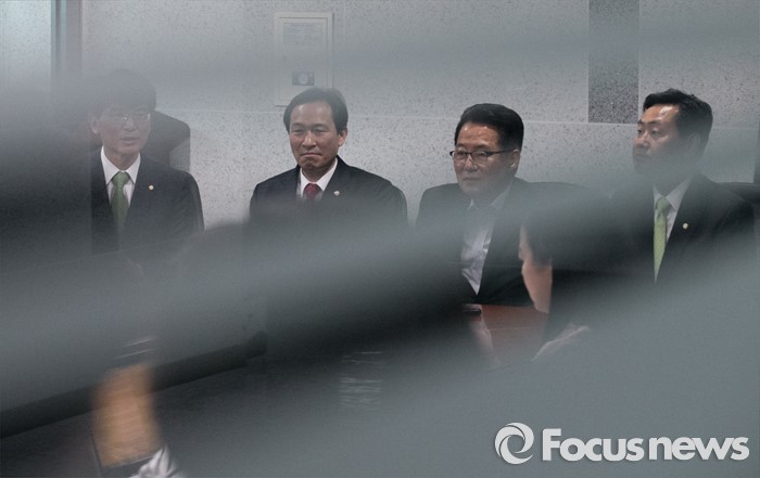 (서울=포커스뉴스) 우상호 더불어민주당 원내대표가 9일 오전 서울 여의도 국회 의원회관에서 박지원 국민의당 원내대표를 예방, 면담을 하고 있다. 왼쪽부터 박완주 더불어민주당 원내수석부대표, 우상호 원내대표, 박지원 국민의당 원내대표, 김관영 원내수석부대표.