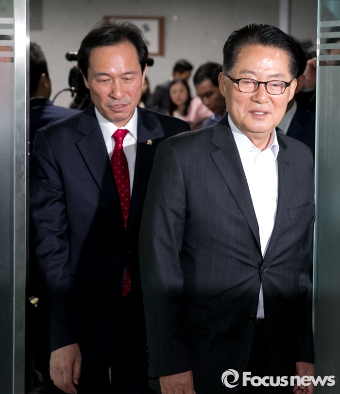 | △ 공개 발언 마치고 나서는 우상호-박지원 |