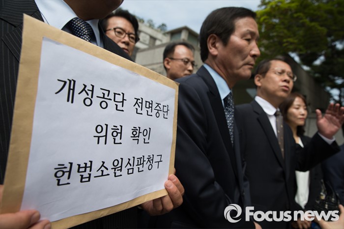 (서울=포커스뉴스) 9일 오전 서울 종로구 헌법재판소 앞에서 정기섭 개성공단기업협회 회장과 개성공단 비상대책위원회 관계자들이 정부의 개성공단 전면중단 조치에 대한 위헌심판 청구서 제출에 앞서 기자회견을 하고 있다.