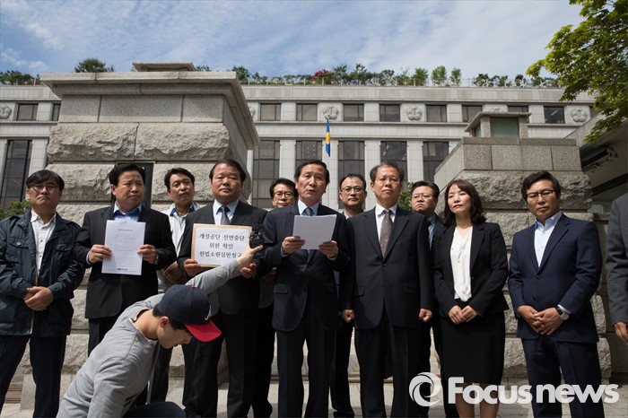 (서울=포커스뉴스) 9일 오전 서울 종로구 헌법재판소 앞에서 정기섭(왼쪽 네번째) 개성공단기업협회 회장과 개성공단 비상대책위원회 관계자들이 정부의 개성공단 전면중단 조치에 대한 위헌심판 청구서 제출에 앞서 기자회견을 하고 있다.