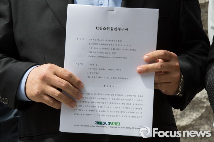 (서울=포커스뉴스) 9일 오전 서울 종로구 헌법재판소 앞에서 정기섭 개성공단기업협회 회장과 개성공단 비상대책위원회 관계자들이 정부의 개성공단 전면중단 조치에 대한 위헌심판 청구서 제출에 앞서 기자회견을 하고 있다.
