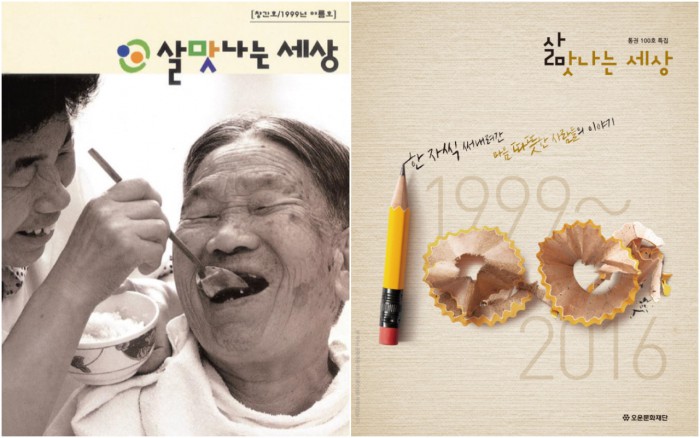 오운문화재단 관계자는 "선행∙미담 사례를 발굴하고 널리 알려 사회를 밝게 만들고자 애써 온 '살맛나는 세상'이 앞으로도 그 역할을 꾸준히 실천해 책자의 명칭처럼 진정으로 '살맛나는 세상'을 만드는데 기여하겠다"고 밝혔다.1999년 5월에 발행한 '살맛나는 세상' 창간호(왼쪽)와 올 5월로 통권 100호를 맞이한 '살맛나는 세상' 특집호.<사진제공=코오롱>