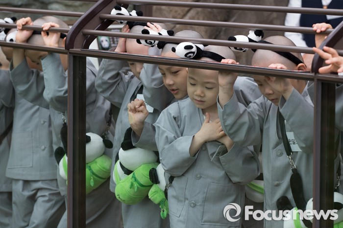 (용인=포커스뉴스) 9일 오전 경기도 용인시 에버랜드에서 동자승들이 판다들을 구경하며 즐거운 시간을 보내고 있다.