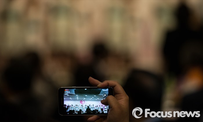 (서울=포커스뉴스) 9일 오전 서울 종로구 세종문화회관에서 열린 '2016 어버이날 孝 사랑 큰잔치' 의 한 참여자가 휴대전화를 이용해 축하공연을 촬영하고 있다.