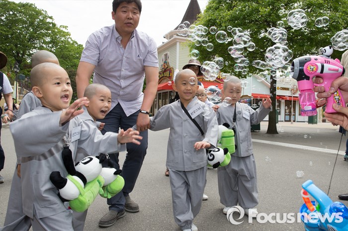 (용인=포커스뉴스) 9일 오전 경기도 용인시 에버랜드에서 동자승들이 비눗방울을 터뜨리며 즐거운 시간을 보내고 있다.