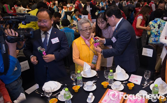 (서울=포커스뉴스) 9일 오전 서울 종로구 세종문화회관에서 열린 '2016 어버이날 孝 사랑 큰잔치' 에 참석한 정진엽(오른쪽) 보건복지부 장관이 한 어르신께 카네이션을 선물하고 있다.