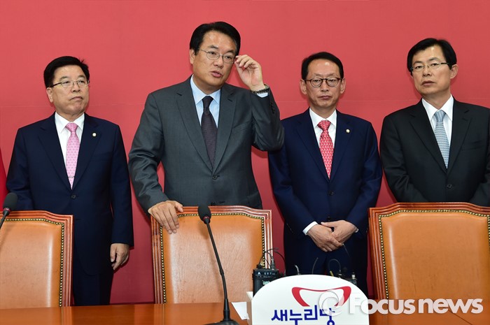 (서울=포커스뉴스) 정진석(왼쪽 두번째) 새누리당 원내대표가 9일 오전 서울 여의도 국회에서 신임 원내대표단과의 티타임에 앞서 모두발언을 하고 있다.