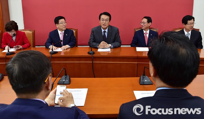 (서울=포커스뉴스) 정진석(왼쪽 세번째) 새누리당 원내대표가 9일 오전 서울 여의도 국회에서 열린 신임 원내대표단과의 티타임에 참석해 모두발언을 하고 있다.