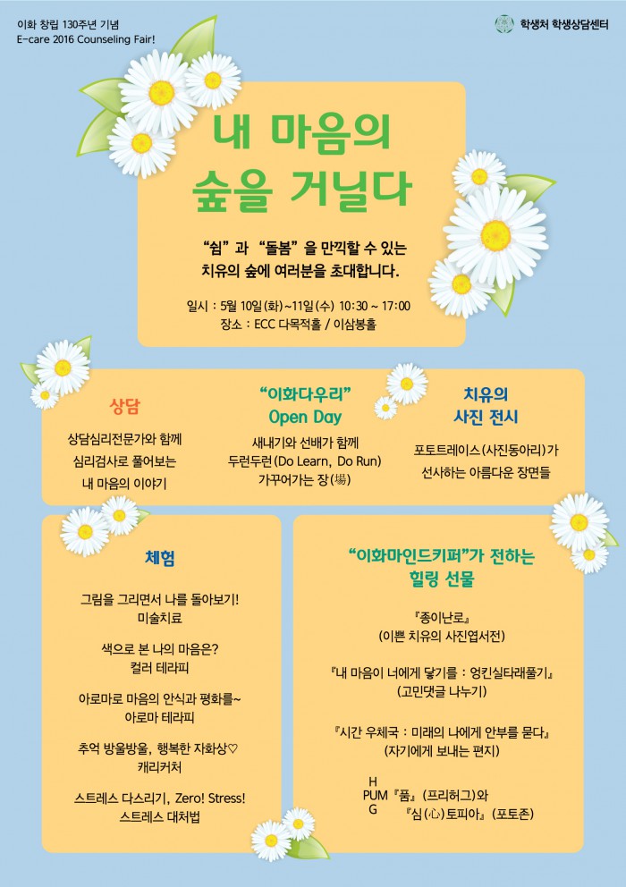 이화여대는 오는 10일부터 11일까지 서울 서대문구에 위치한 이화여대 ECC(Ewha Campus Complex·이화캠퍼스복합단지) 다목적홀과 이삼봉홀에서 '내 마음의 숲을 거닐다'라는 주제로 대학생 정신건강 증진을 위한 '2016 카운슬링 페어'를 연다.