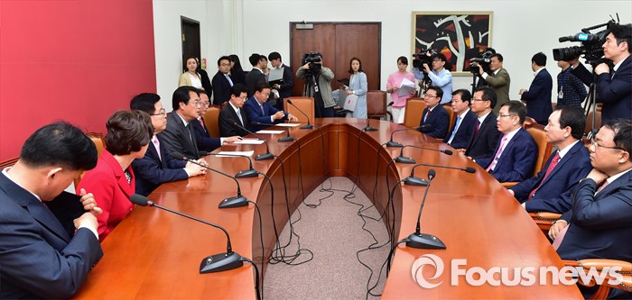 | △ 與 신임 원내대표단과 티타임 갖는 정진석 |