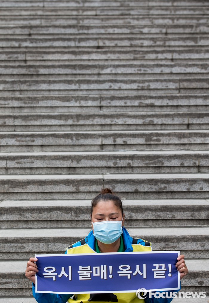(서울=포커스뉴스) 9일 오후 서울 종로구 세종문화회관 앞 계단에서 옥시 가습기 살균 피해자 안은주씨가 옥시 불매 집중 행동 돌입선언 기자회견을 하고 있다.