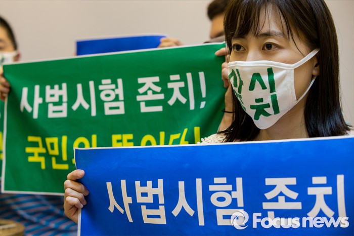 (서울=포커스뉴스) 9일 오후 서울 마포구 국민의당 당사에서 '사법시험존치를 위한 고시생 모임' 소속 학생들이 사시 존치를 요구하는 펼침막을 들고 안철수 상임공동대표를 기다리고 있다. '사법시험존치를 위한 고시생 모임'에서 활동하는 수험생 6명은 이날 오전 국민의당 당사 회의실을 점거, 기자회견을 열고 안 대표와의 면담을 요청했다.
