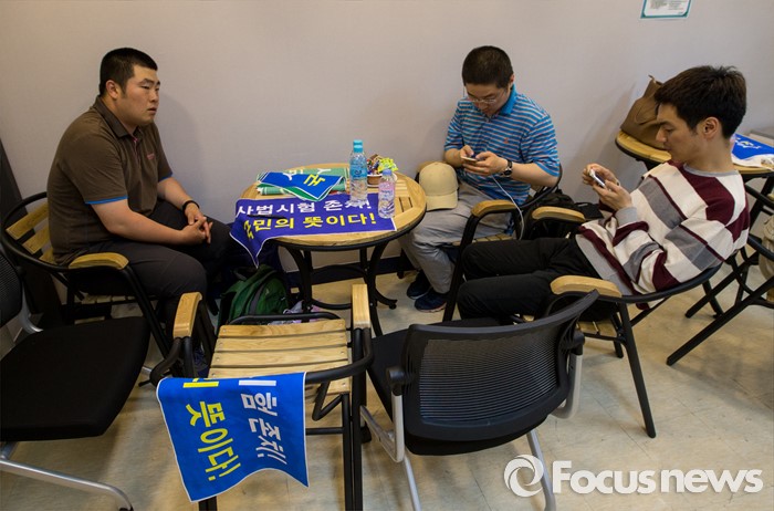 (서울=포커스뉴스) 9일 오후 서울 마포구 국민의당 당사에서 '사법시험존치를 위한 고시생 모임' 소속 학생들이 안철수 상임공동대표를 기다리고 있다. '사법시험존치를 위한 고시생 모임'에서 활동하는 수험생 6명은 이날 오전 국민의당 당사 회의실을 점거, 기자회견을 열고 안 대표와의 면담을 요청했다.
