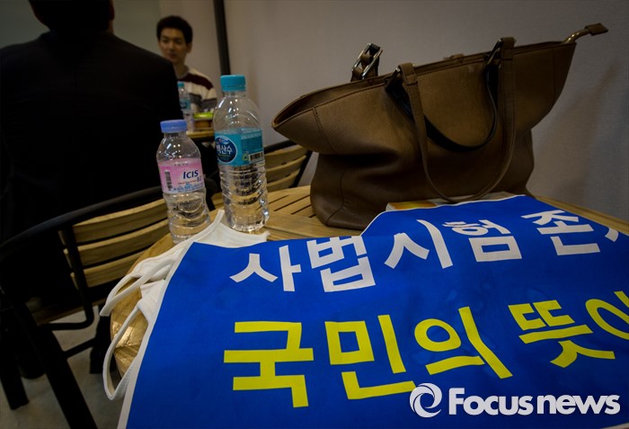 (서울=포커스뉴스) 9일 오후 서울 마포구 국민의당 당사에서 '사법시험존치를 위한 고시생 모임' 소속 학생이 사시 존치를 요구하는 펼침막을 탁자 위에 펼쳐놓고 있다. '사법시험존치를 위한 고시생 모임'에서 활동하는 수험생 6명은 이날 오전 국민의당 당사 회의실에서 기자회견을 열고 안철수 국민의당 상임공동대표와 면담을 요청했다.