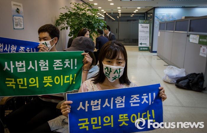 (서울=포커스뉴스) 9일 오후 서울 마포구 국민의당 당사에서 '사법시험존치를 위한 고시생 모임' 소속 학생들이 사시 존치를 요구하는 펼침막을 들고 안철수 상임공동대표를 기다리고 있다. '사법시험존치를 위한 고시생 모임'에서 활동하는 수험생 6명은 이날 오전 국민의당 당사 회의실을 점거, 기자회견을 열고 안 대표와의 면담을 요청했다.