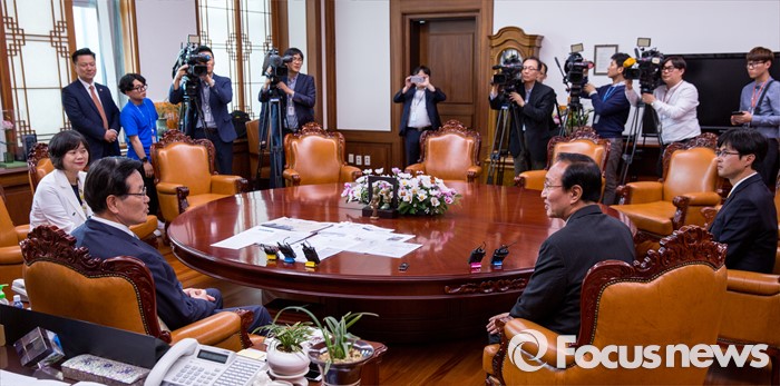 (서울=포커스뉴스) 정의화(왼쪽 두 번째) 국회의장이 9일 오후 서울 여의도 국회에서 노회찬 정의당 원내대표를 비롯한 신임 원내대표단과 면담 하고 있다.