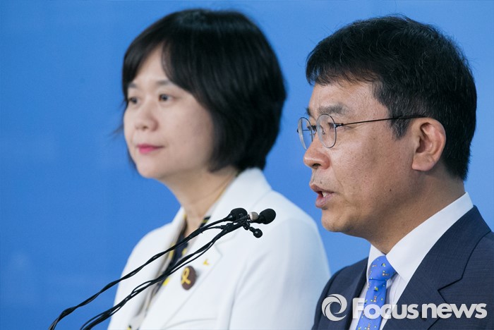 (서울=포커스뉴스) 9일 오후 서울 여의도 국회 정론관에서 열린 정의당 원내 당직 인선 발표 기자회견에 원내대변인으로 임명된 김종대 비례대표 당선인이 인사말을 하고 있다.왼쪽은 원내수석부대표로 임명된 이정미 당선인.